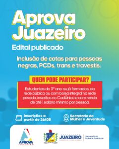 A Prefeitura de Juazeiro, por meio da Secretaria da Mulher e Juventude/SMJ, divulgou o edital de inscrições para o processo seletivo do Programa Aprova Juazeiro. A iniciativa, que agora conta com inclusão de cotas, vai beneficiar estudantes da rede pública com bolsas de estudo integrais em cursos pré-vestibulares e Pré-Enem, oferecidos por instituições privadas credenciadas no município.