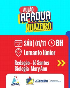 Neste sábado (1º), a Prefeitura de Juazeiro, por meio da Secretaria da Mulher e Juventude/SMJ realiza o terceiro ciclo de aulões do programa Aprova Juazeiro. A programação será realizada no Colégio Lomanto Júnior, localizado na Rodovia Lomanto Júnior, Km 3 – s/n, Castelo Branco, das 8h às 12h. Interessados ainda podem garantir uma vaga.