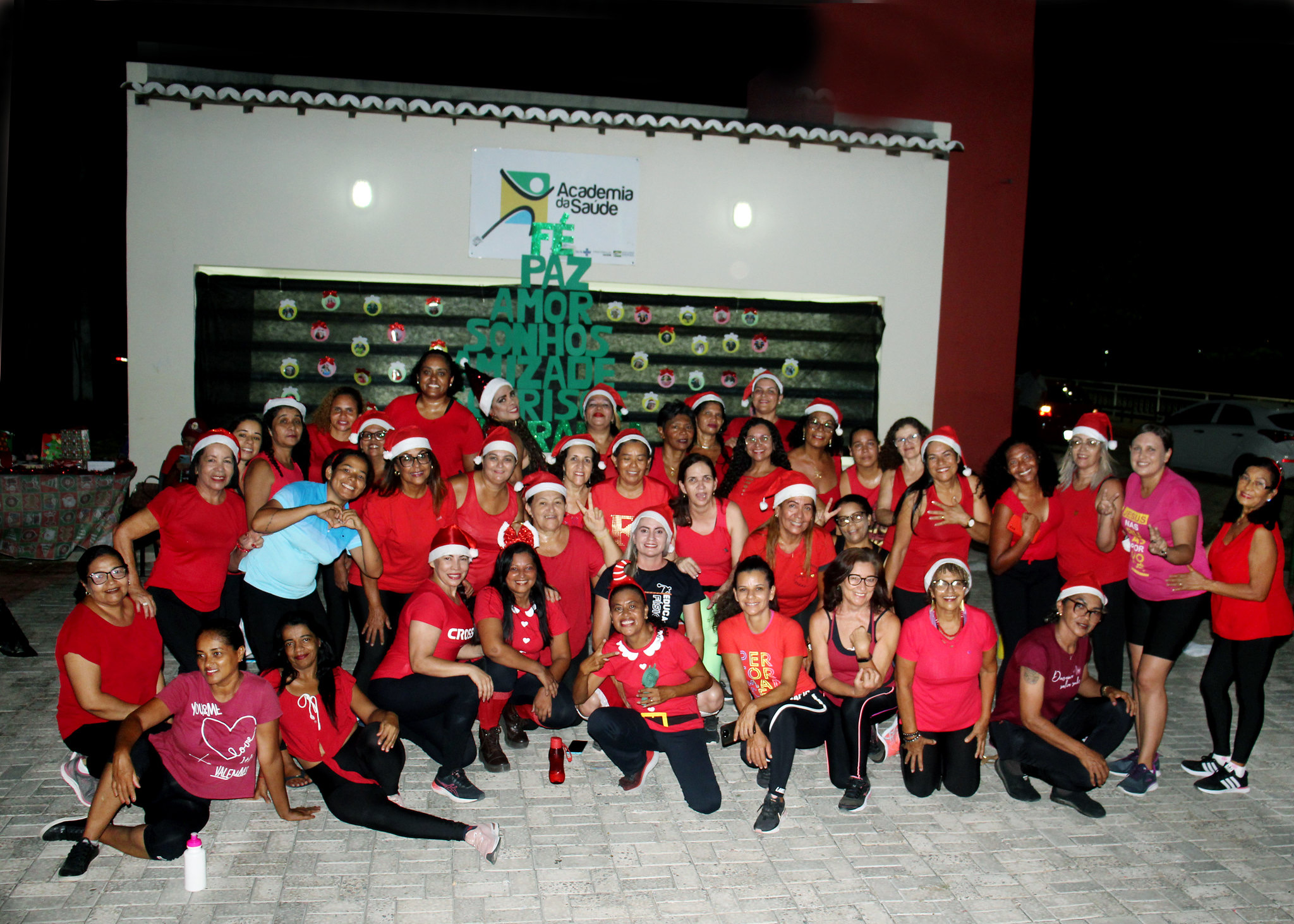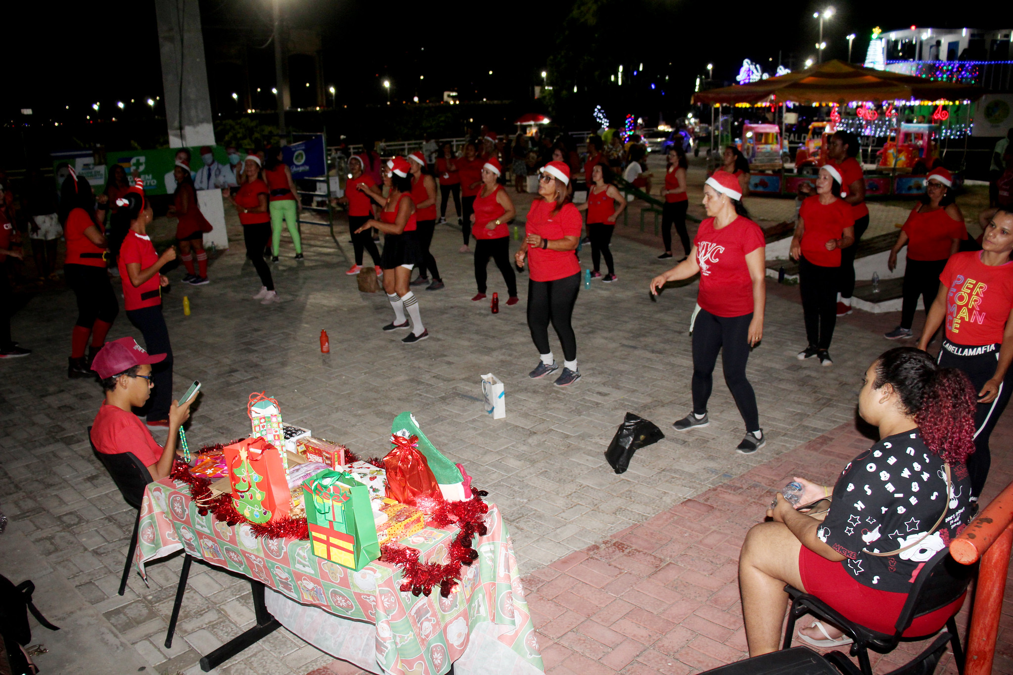 O espaço estava todo decorado para receber a turma de, aproximadamente, 50 pessoas caracterizadas com seus gorros e as cores do Natal. Também foi montada uma playlist especial com ritmos típicos da época. “Uma vez por mês escolhemos uma temática referente à saúde, como o Outubro Rosa, por exemplo, ou uma data especial e inserimos na nossa aula para deixar o grupo ainda mais envolvido e animado. Nossa ideia é promover saúde em diversos aspectos, inclusive mental, com a socialização”, explicou a profissão de educação física, Gilmara de Melo.
