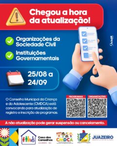A Casa dos Conselhos de Juazeiro informa que o Conselho Municipal da Criança e do Adolescente/CMDCA publicou o Edital nº 02/2025 convocando Organizações da Sociedade Civil/OSCs e instituições governamentais a realizarem a atualização de seus registros e programas. O objetivo é manter em dia as informações junto ao conselho e garantir a regularidade no Sistema […]