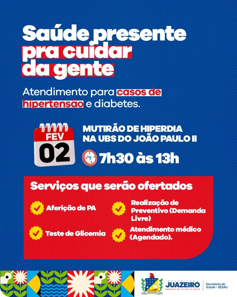 O mutirão dedicado aos hipertensos e diabéticos está marcado para o próximo domingo (2), das 7h30 às 13h, na Unidade Básica de Saúde (UBS) do bairro João Paulo II. “A iniciativa visa promover o cuidado e o monitoramento de condições crônicas, além de incentivar a prevenção de doenças. A Secretaria de Saúde reforça a importância de um acompanhamento regular para pessoas que convivem com hipertensão e diabetes, condições que exigem controle contínuo para evitar complicações”, destacou o secretário de Saúde, Helder Coutinho.