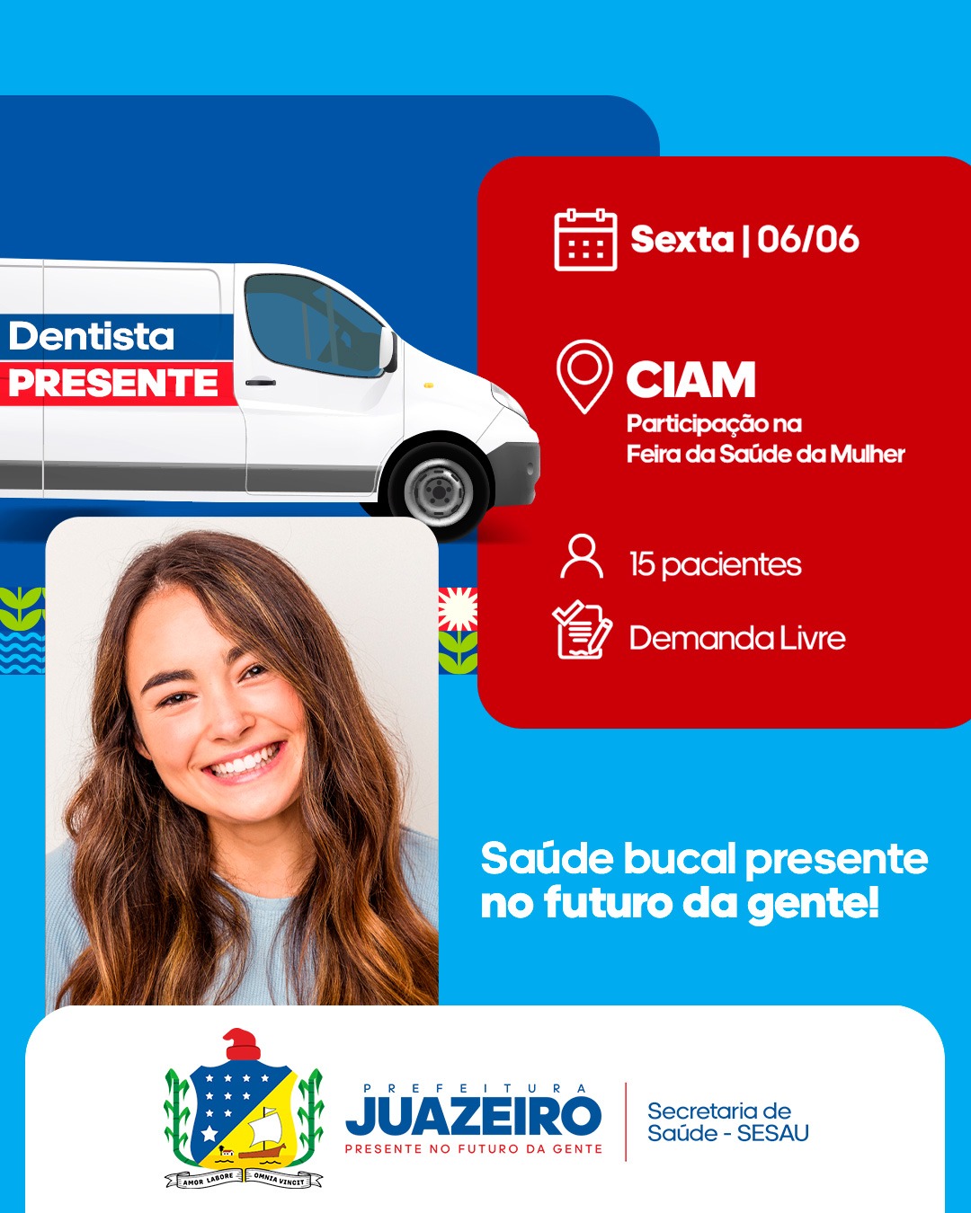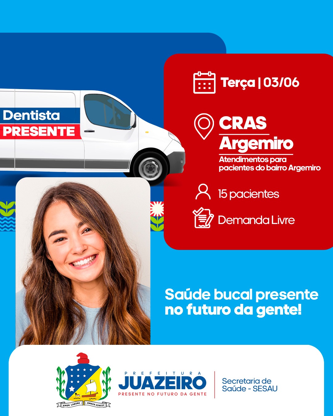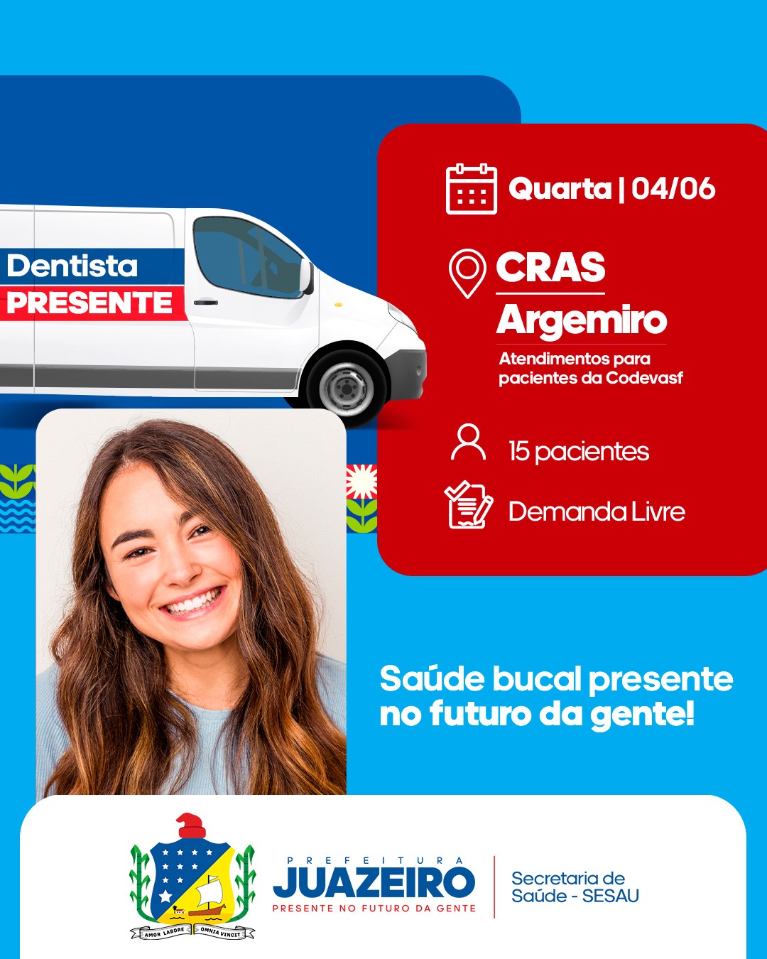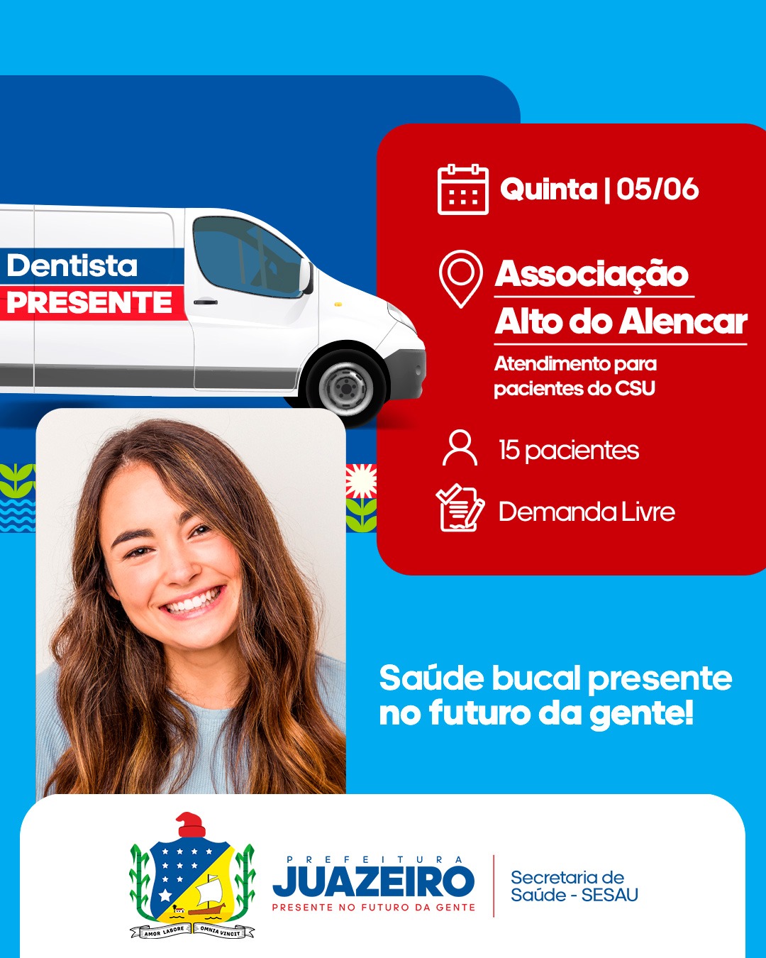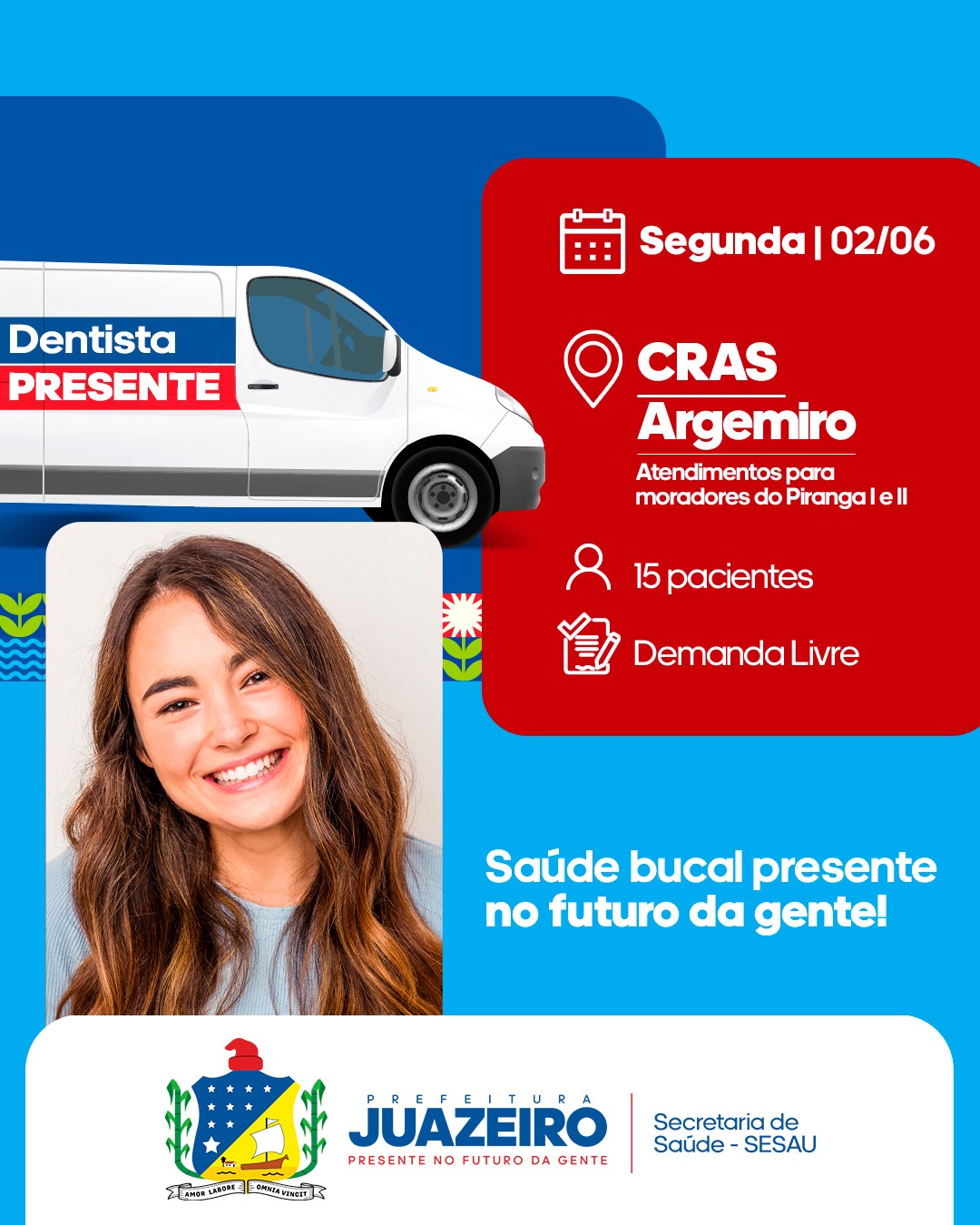 A Unidade Móvel de Atendimento Odontológico/UMO segue levando serviços para a população. A iniciativa realizada pela Prefeitura de Juazeiro, por meio da Secretaria Municipal de Saúde/ Sesau irá oferecer, entre os dias 02 e 06 de junho, 15 atendimentos diários a partir das 8h. É necessário que os pacientes apresentem RG, CPF e Cartão SUS.
