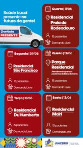 A Unidade Móvel de Atendimento Odontológico/UMO segue levando serviços para a população. A iniciativa realizada pela Prefeitura de Juazeiro, por meio da Secretaria Municipal de Saúde/ Sesau irá oferecer, entre os dias 09 e 13 de junho, 15 atendimentos diários a partir das 8h. É necessário que os pacientes apresentem RG, CPF e Cartão SUS.
