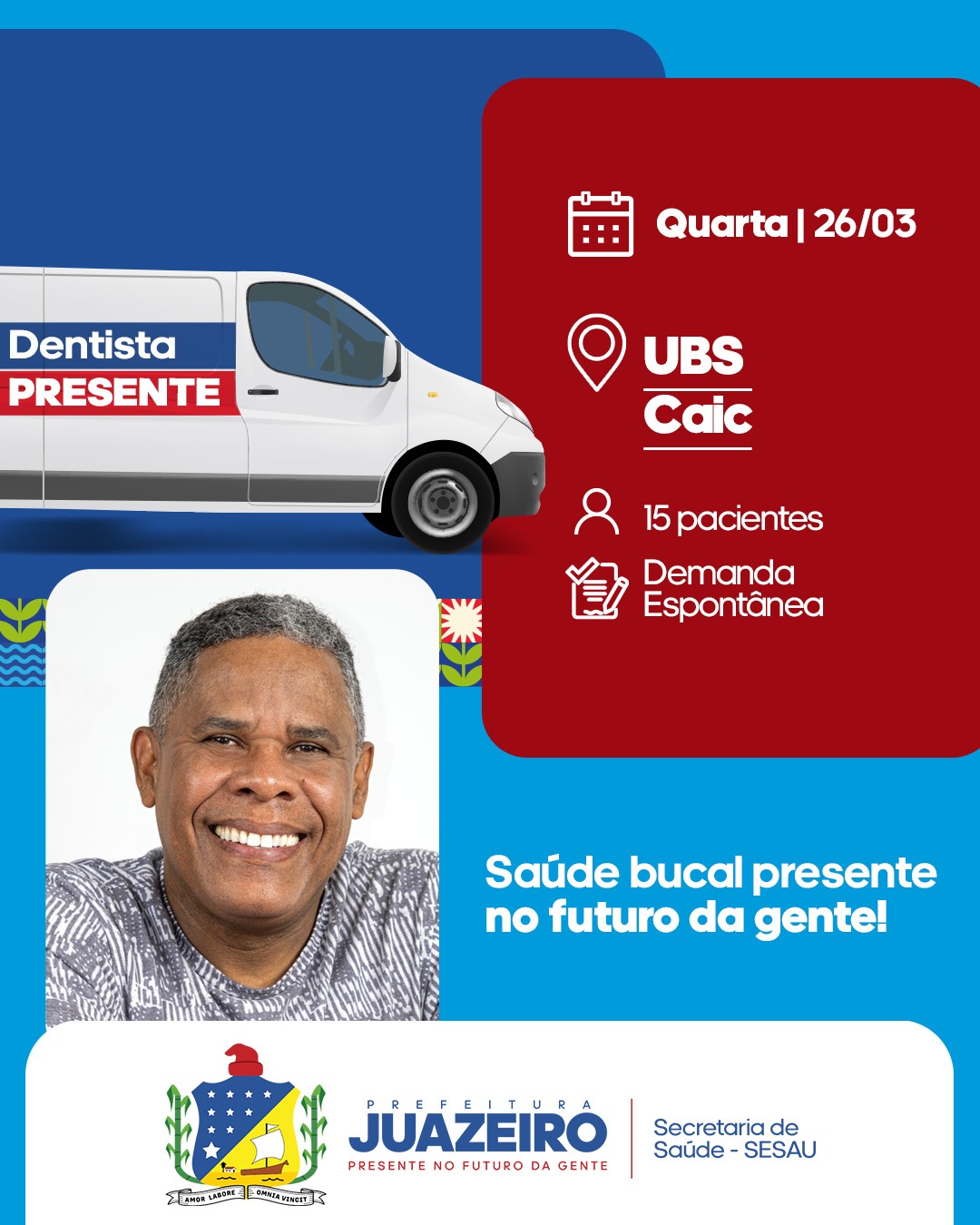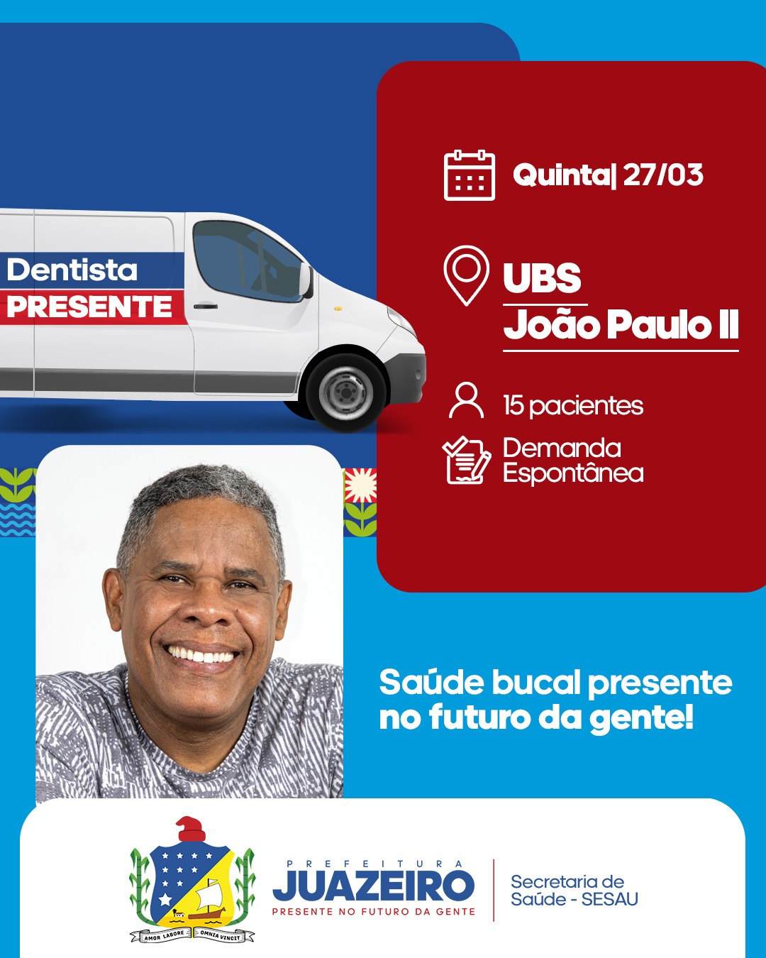 A Unidade Móvel de Atendimento Odontológico (UMO) segue levando serviços para a população. A iniciativa realizada pela Prefeitura de Juazeiro, por meio da Secretaria de Saúde (Sesau), irá oferecer entre os dias 24 e 27 deste mês, 15 atendimentos diariamente, a partir das 8h. É necessário que os pacientes apresentem RG, CPF e Cartão SUS.