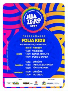 Localizado no Paço Municipal, ao lado da Seculte, o Folia Kids acontece sempre no período da tarde, com uma programação acessível e acolhedora. O palco recebe atrações que já conquistaram o público infantil, como Tio Diego, Dó Ré Mi e a Banda Pirulito, além do clima animado do Pôr do Samba, criando um ambiente onde diferentes gerações celebram juntas a cultura e a alegria do Carnaval de Juazeiro.