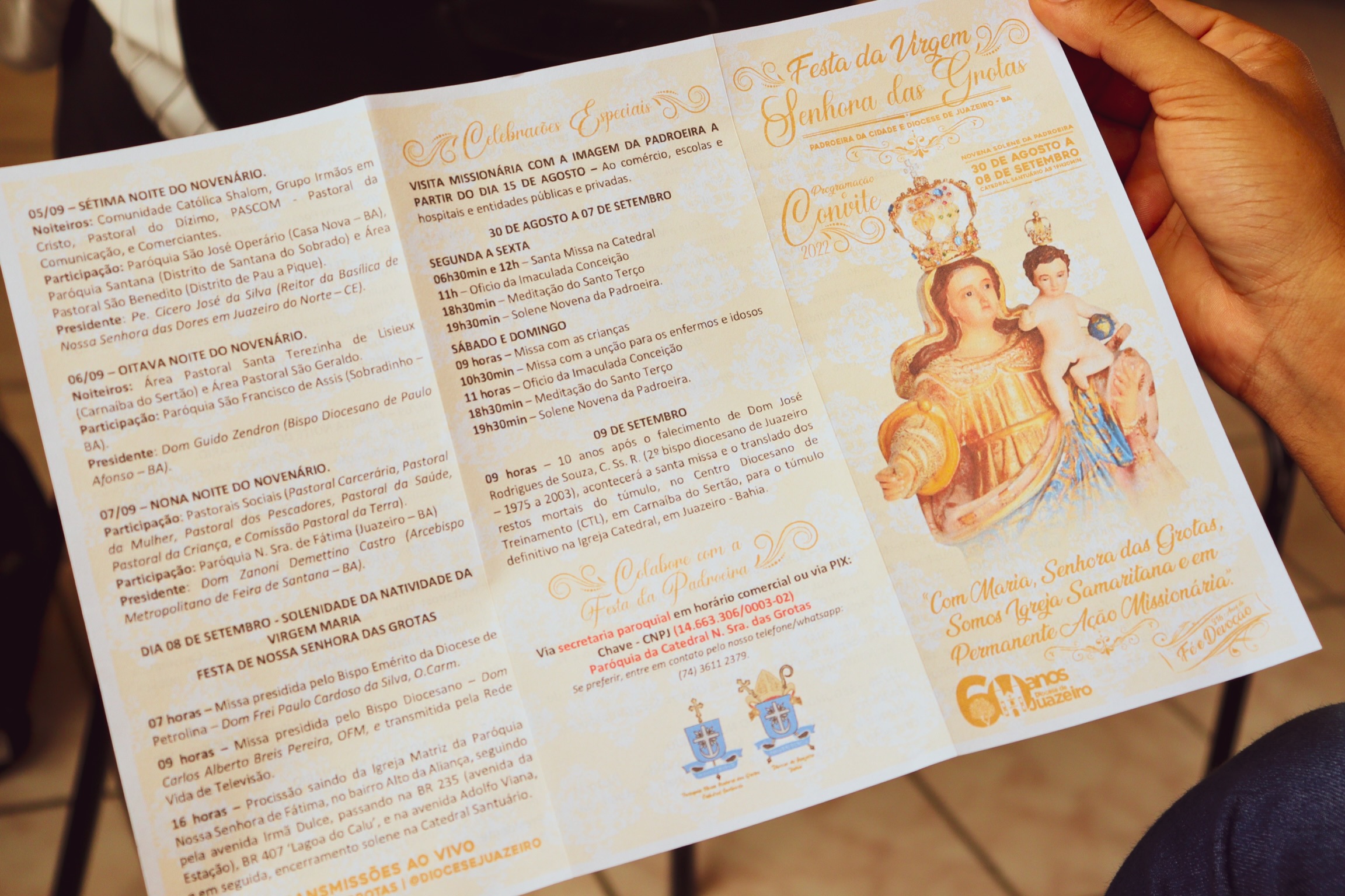 Com o tema ‘Com Maria, Senhora das Grotas, Somos Igreja Samaritana e em Permanente Ação Missionaria’, a Diocese de Juazeiro lançou na manhã desta quarta-feira (17), a programação oficial da festa da padroeira Nossa Senhora das Grotas, que acontecerá de 30 de agosto a 08 de setembro, e esse ano contará com a tradicional procissão, que foi cancelada durante dois anos, em razão da pandemia da Covid-19.