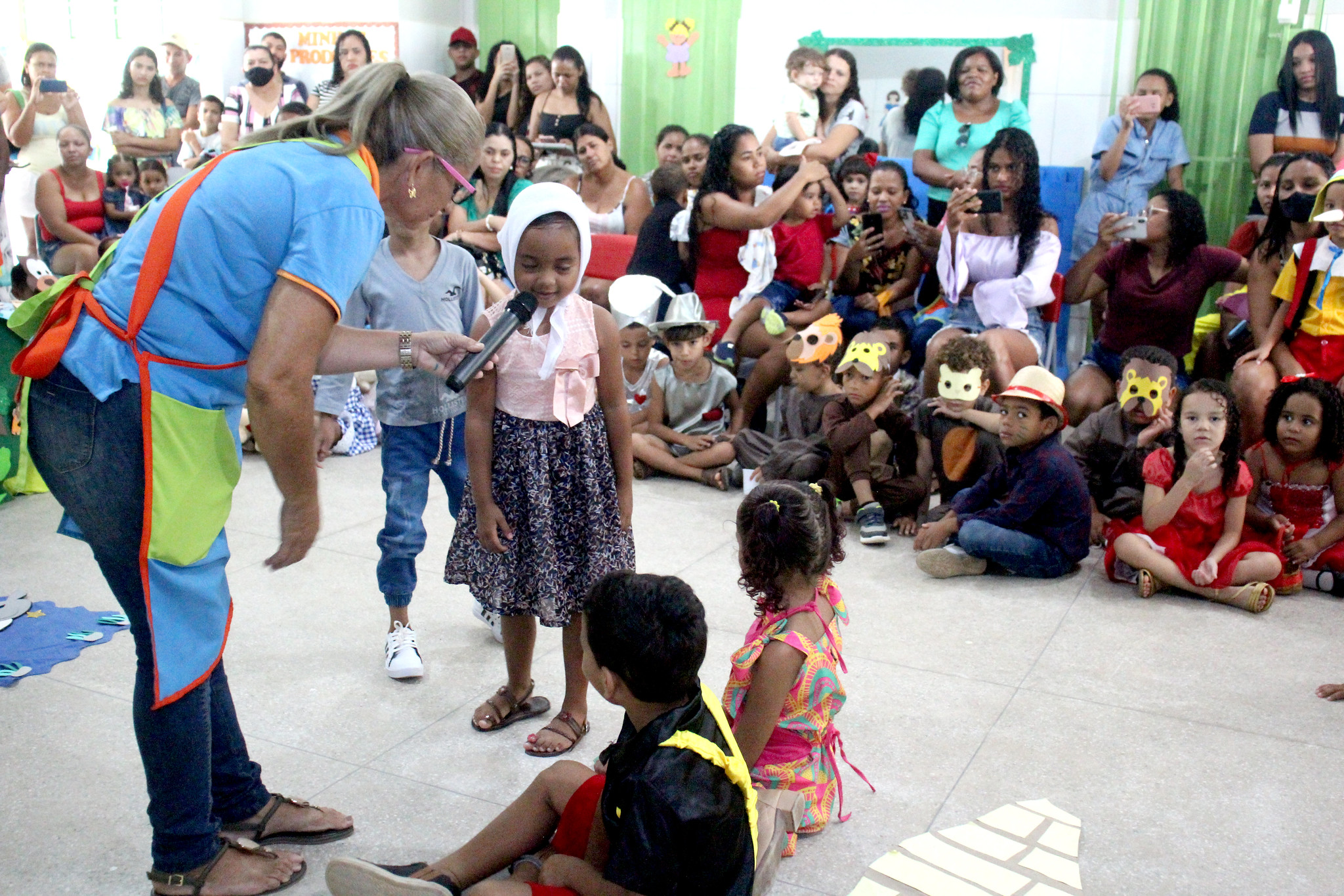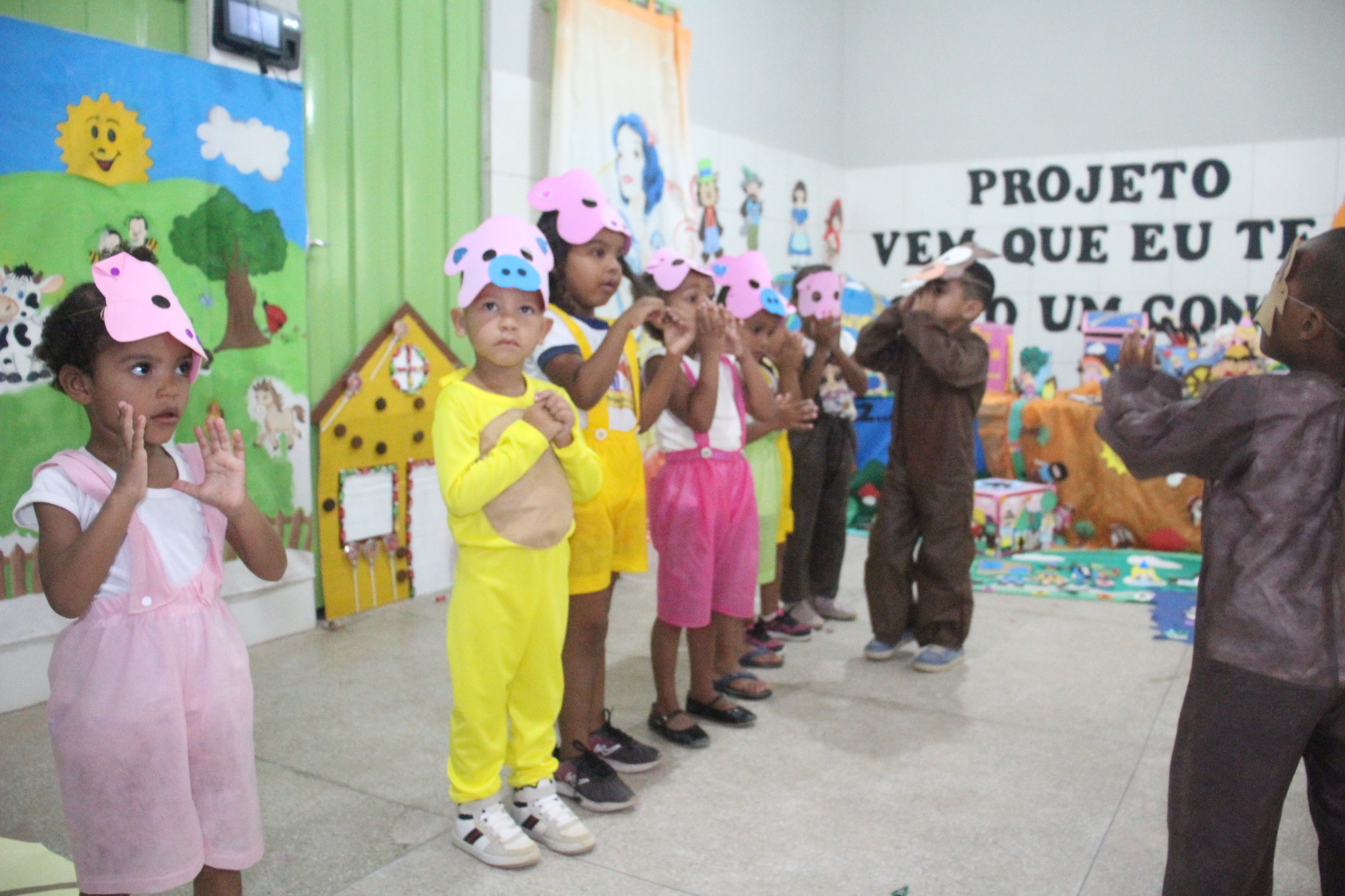 O colorido dos personagens dos contos infantis encheu de alegria a culminância do projeto “Vem que eu te conto um conto”, realizado pela Escola Municipal de Educação Infantil Jandira Borges, localizada no bairro Tabuleiro, em Juazeiro. A ação aconteceu neste sábado (26) e teve o objetivo de apresentar aos pais dos alunos todo o trabalho de incentivo a leitura desenvolvido com as crianças, e a todas a produções realizadas durante o tempo de duração do projeto.