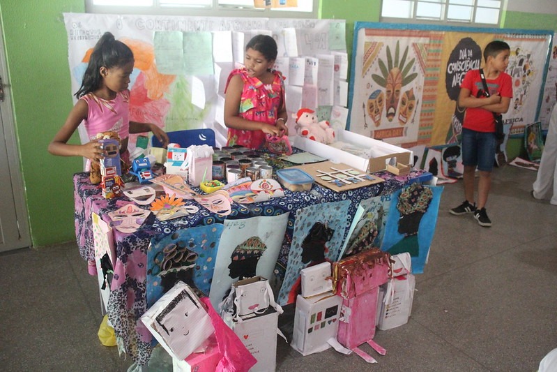 As escolas também aproveitaram a proximidade com o Dia da Consciência Negra, celebrado em 20 de novembro, para ampliar a sua Feira. Na Escola Municipal José Padilha de Souza, no bairro Alto do Cruzeiro, a Feira de Empreendedorismo agregou a comercialização de produtos inspirados na cultura africana e apresentações culturais. “Desde outubro nós estamos com o projeto ‘Uma fantástica viagem pelo continente africano’, discutindo diversos temas e explorando danças, contos, religiões, culinária e história. A partir de cada tema, eles foram produzindo materiais para a comercialização na Feira, como chaveiros com máscaras e figuras da África, brinquedos produzidos com sucata, pulseiras, tambores, comidas de origem africana, etc”, relatou a coordenadora pedagógica da Escola José Padilha, Laís Vargas.