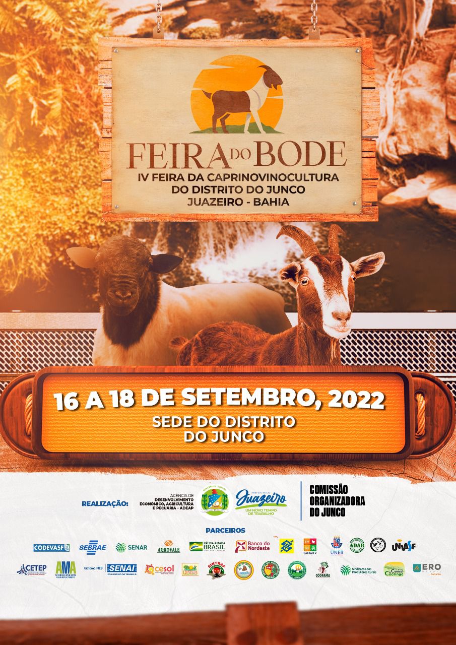 A tradicional Feira do Bode chega no próximo final de semana (de 16 a 18) ao distrito do Junco. Realizado pela Prefeitura de Juazeiro, através da Agência de Desenvolvimento Econômico, Agricultura e Pecuária (Adeap) em parceria com a Comissão Organizadora do Distrito do Junco, o importante evento voltado à valorização e fomento da caprinovinocultura, vai acontecer na sede do distrito.