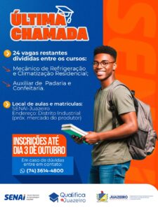 Ao todo, ainda estão disponíveis 24 vagas, distribuídas entre três cursos de qualificação profissional: Auxiliar de Padaria e Confeitaria; Mantenedor de Tablets e Smartphones, e Mecânico de Refrigeração e Climatização Residencial. Os cursos são presenciais e as aulas terão início no próximo dia 3 de outubro, com turmas de segunda a sexta-feira, das 18h40 às 21h40, na sede do Senai Juazeiro.
