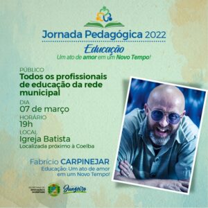 A palestra será ministrada pelo escritor e jornalista Fabrício Carpinejar, que já está na cidade. Todos os profissionais da rede municipal de ensino de Juazeiro poderão participar do evento e após a palestra, também será realizada uma noite de autógrafos com Fabrício, que é autor de 48 livros, entre eles, “Colo, por favor! reflexões em tempos de isolamento – (2020)”, “Coragem de Viver – (2021)” e “Biografia de uma Árvore – (2002)”, premiado pela Academia Brasileira de Letras, através do Prêmio Nacional Olavo Bilac.