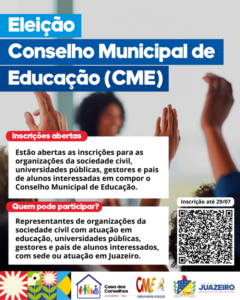 A Prefeitura de Juazeiro, por meio do Conselho Municipal de Educação (CME), abriu o processo de inscrição para a eleição das organizações da sociedade civil e de outras representações governamentais, que irão compor o CME, gestão 2025-2029. A iniciativa é uma oportunidade importante para fortalecer a participação popular na construção de políticas públicas voltadas à área educacional do município.