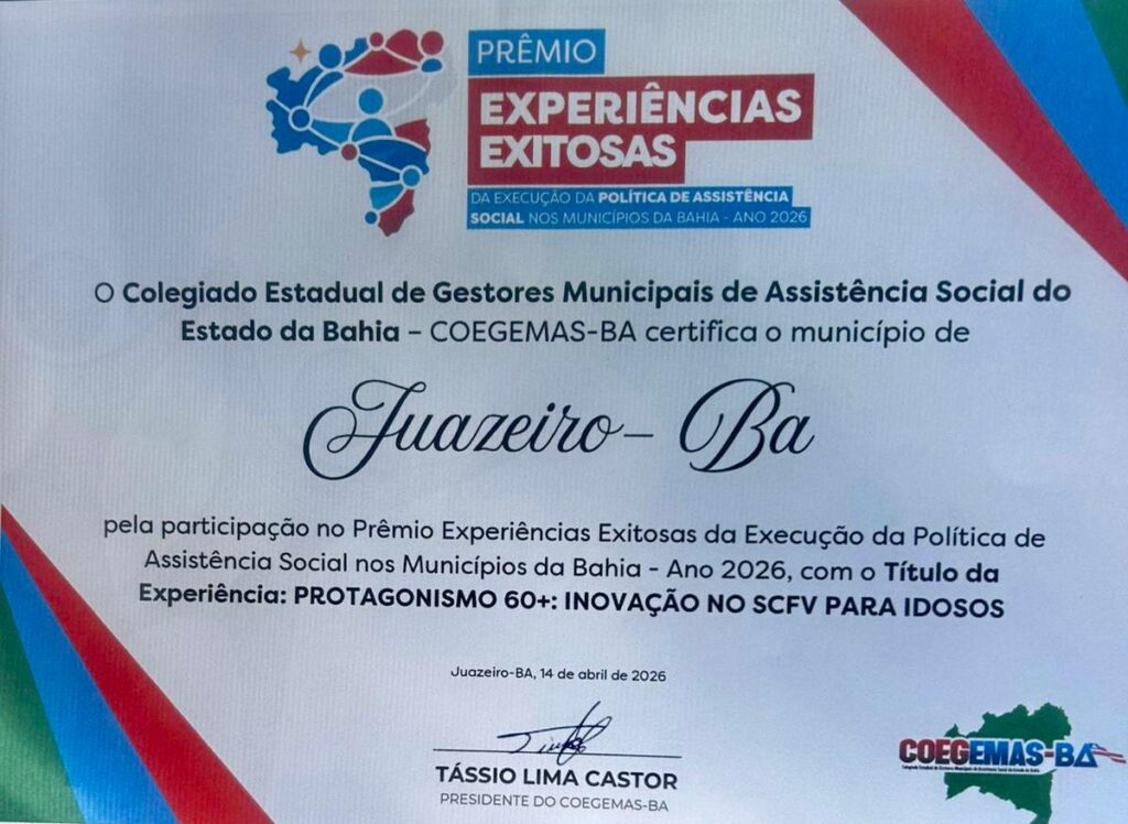 A certificação foi concedida pelo Colegiado Estadual de Gestores Municipais de Assistência Social do Estado da Bahia (Coegemas-BA), dentro da programação do encontro, que reúne gestores, equipes técnicas e representantes da área de diversas regiões do estado. A programação desta terça-feira (14) também contou com palestras e painéis voltados à gestão do Sistema Único de Assistência Social (SUAS) e à consolidação da assistência social como política pública.