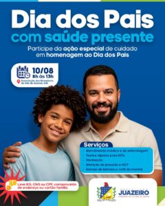Em celebração ao Dia dos Pais, a Secretaria Municipal de Saúde de Juazeiro/Sesau, realizará neste domingo (10) uma programação especial voltada à promoção da saúde e ao cuidado com os homens do município. A ação acontecerá na sede da Associação dos Moradores do bairro Alto do Alencar, das 8h às 13h.