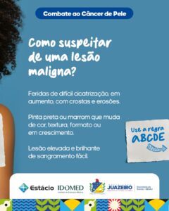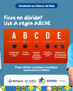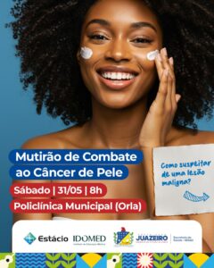 A Secretaria de Saúde Municipal de Juazeiro/ Sesau, realizará no próximo sábado (31) um Mutirão de Combate ao Câncer de Pele, em parceria com o Instituto de Educação Médica (Idomed). A ação acontecerá a partir das 8h, na Policlínica Municipal, localizada na Orla I da cidade.