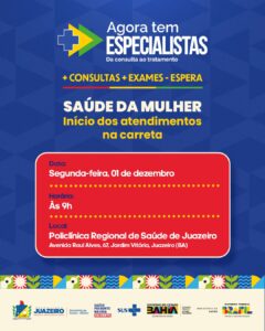 A Prefeitura de Juazeiro, por meio da Secretaria Municipal de Saúde (Sesau), em parceria com a Secretaria de Saúde do Estado da Bahia (Sesab), Ministério da Saúde e o Governo Federal, realizará a cerimônia de chegada da Unidade Móvel Saúde da Mulher, que integra o programa “Agora Tem Especialistas”, na próxima segunda-feira, 1º de dezembro, a partir das 9h, na Policlínica Regional, localizada na Av. Raul Alves, nº 67, bairro Jardim Vitória. A ação marca o início de uma importante ampliação da assistência especializada destinada à população feminina de Juazeiro e região.