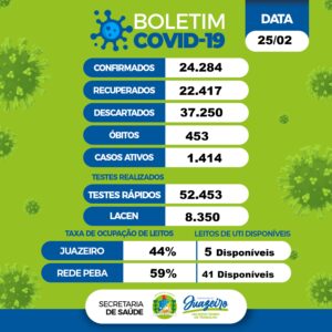 Foram confirmados 34 novos casos da doença. De acordo com o levantamento, 24.284 moradores foram infectados desde o início da pandemia na cidade, dos quais 22.417 já estão recuperados. Os casos descartados somam 37.250. Juazeiro tem 1.414 casos ativos do novo coronavírus.