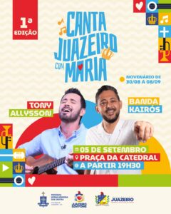 Um encontro de música e fé. A cidade de Juazeiro vai sediar, na próxima sexta-feira (5), o “1º Canta Juazeiro com Maria, Mãe das Grotas”, festival de música católica, apoiado pela Prefeitura de Juazeiro, por meio da Secretaria Municipal de Cultura, Turismo e Esportes/Seculte. O evento faz parte da programação do Novenário de Nossa Senhora das Grotas, padroeira da cidade e da Diocese local (que abrange nove municípios).