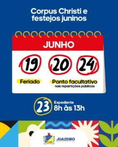A Prefeitura de Juazeiro informa que, em virtude dos feriados de Corpus Christi (19 de junho) e São João (24 de junho), o expediente nas repartições públicas municipais será alterado. Conforme estabelecido pelas portarias nº 138/2025 e nº 139/2025, o ponto facultativo se estenderá também para os dias 20 e 24 de junho. No dia 23, véspera de São João, o expediente será reduzido, funcionando das 8h às 13h em toda a Administração Direta, Indireta e Autárquica.