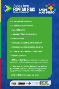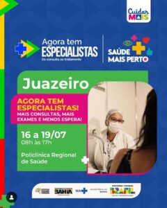 A ação é uma iniciativa do Governo Federal e do Estado, em parceria com a Prefeitura de Juazeiro, e reúne serviços gratuitos, essenciais e de alta demanda, como Ultrassonografia, Eletrocardiograma, Mamografia, Laboratório de Coleta, Preventivo, Consulta com Nutricionista, Consulta com Ginecologista, Consulta com Mastologista, Odontologia e Oftalmologia, com destaque para consultas, cirurgias de catarata, pterígio e limpeza de lente.