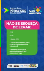 O evento contará com demanda agendada e espontânea. O público interessado em participar, deve procurar a Sesau ou a Unidade Básica de Saúde mais próxima, a partir de quarta-feira (16), para realizar os encaminhamentos necessários. Para ser atendido é necessário apresentar RG, CPF, Cartão do SUS e solicitação médica (para exames laboratoriais e ultrassonografia).
