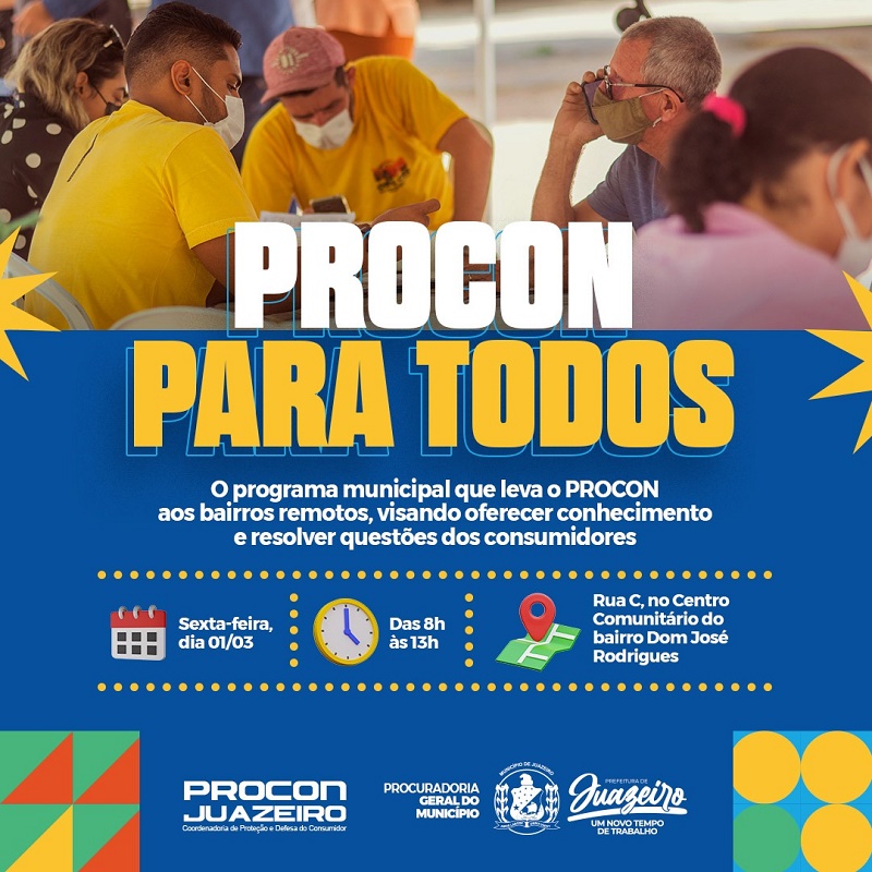 A Prefeitura de Juazeiro, por meio da Procuradoria Geral do Município e do Procon, está organizando uma programação especial para celebrar o Mês do Consumidor, que ocorrerá em março. A primeira ação será realizada no bairro Dom José Rodrigues, nesta sexta-feira (1º), das 8h às 13h, onde o Procon de Juazeiro estará atendendo no Centro Comunitário na Rua C.