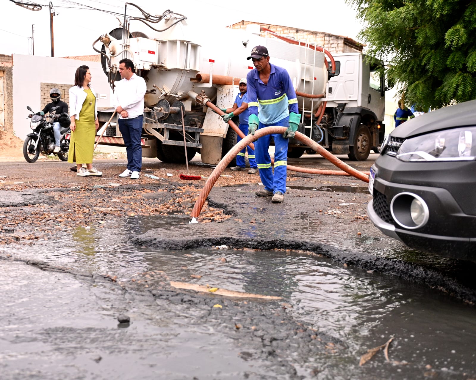 Nesta segunda-feira (06), o prefeito de Juazeiro, Andrei Gonçalves, esteve no bairro Alto da Maravilha, próximo à Lagoa de Calu, para acompanhar de perto o mutirão do Serviço de Água e Saneamento Ambiental (SAAE). Acompanhado da diretora da autarquia, Fabiana Guimarães, o gestor verificou os serviços de desobstrução de esgotos realizados pela equipe, que têm trabalhado intensamente desde a última sexta-feira (03).
