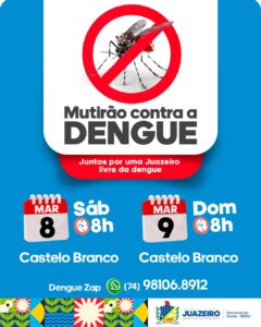 As ações contra o aedes aegypti seguem com programação de cuidados para eliminar os focos do mosquito. No próximo final de semana, sábado (8) e domingo (9), a partir das 8h, as equipes de combate às endemias irão realizar um mutirão no bairro Castelo Branco para sensibilizar os moradores em relação ao cuidado diário com as residências.