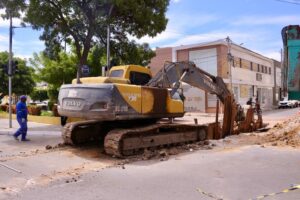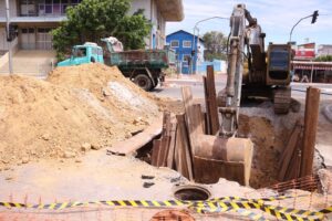 A intervenção no sistema de drenagem no cruzamento entre a Avenida Adolfo Viana e a Rua Canadá, no bairro Maria Goretti, segue em ritmo acelerado. A obra, executada pela Secretaria de Obras Estruturantes/SOEST, agora exige a interdição total das duas vias da avenida para a continuidade dos serviços.