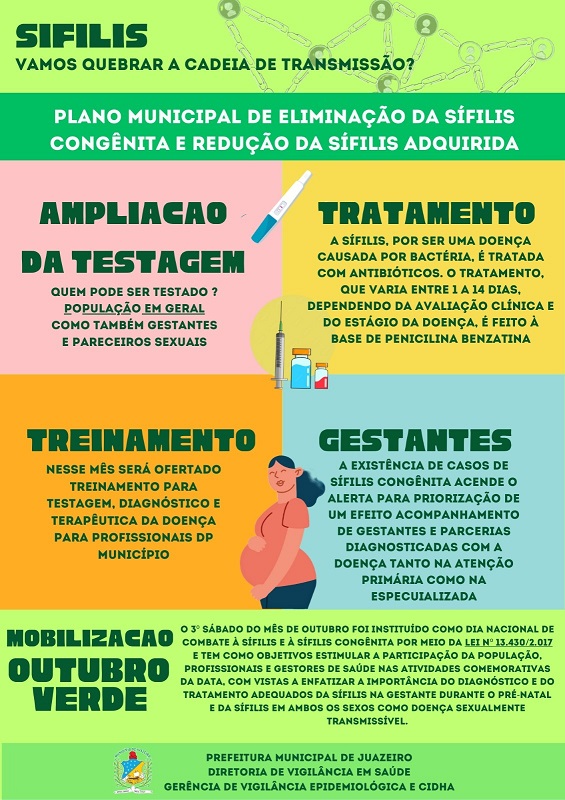 A campanha Outubro Verde tem como objetivo mobilizar a população para os cuidados, prevenção, diagnóstico e tratamento da sífilis e da sífilis congênita. Além da prevenção, a Prefeitura de Juazeiro, através da Secretaria de Saúde (Sesau), reforça a importância da testagem para detectar e iniciar o tratamento.
