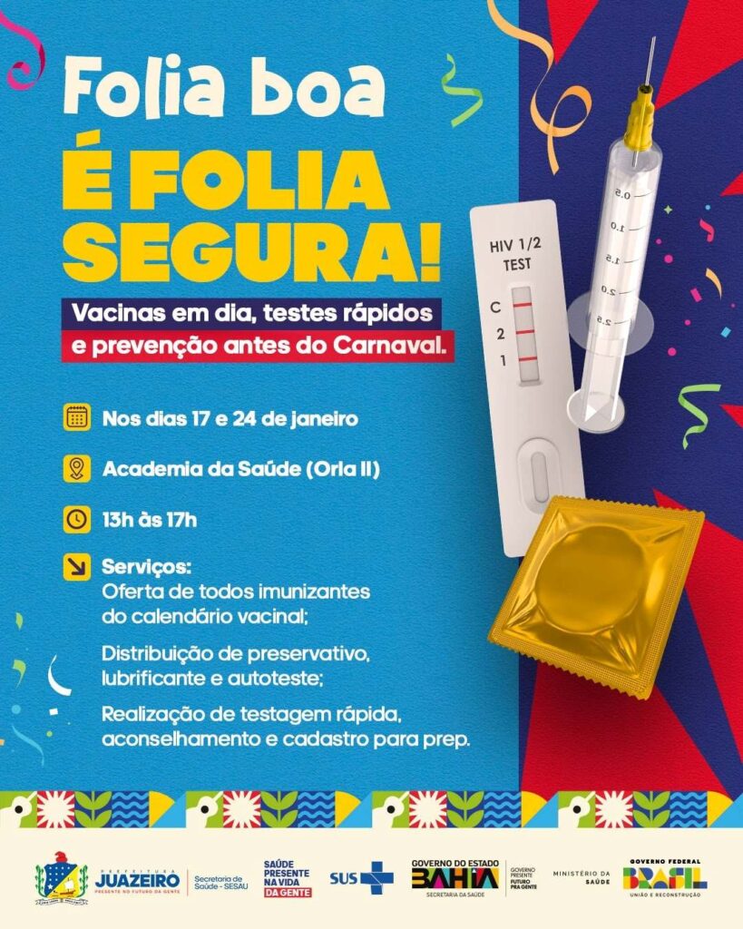 Como parte das ações que antecedem o Carnaval de Juazeiro, que abre oficialmente os festejos momescos na Bahia, a Secretaria Municipal de Saúde (Sesau) realiza uma programação especial voltada à promoção da saúde e à prevenção de doenças. Durante os sábados dos dias 17 e 24 de janeiro, a população poderá acessar diversos serviços gratuitos de saúde na Academia da Saúde, na Orla II, das 13h às 17h.