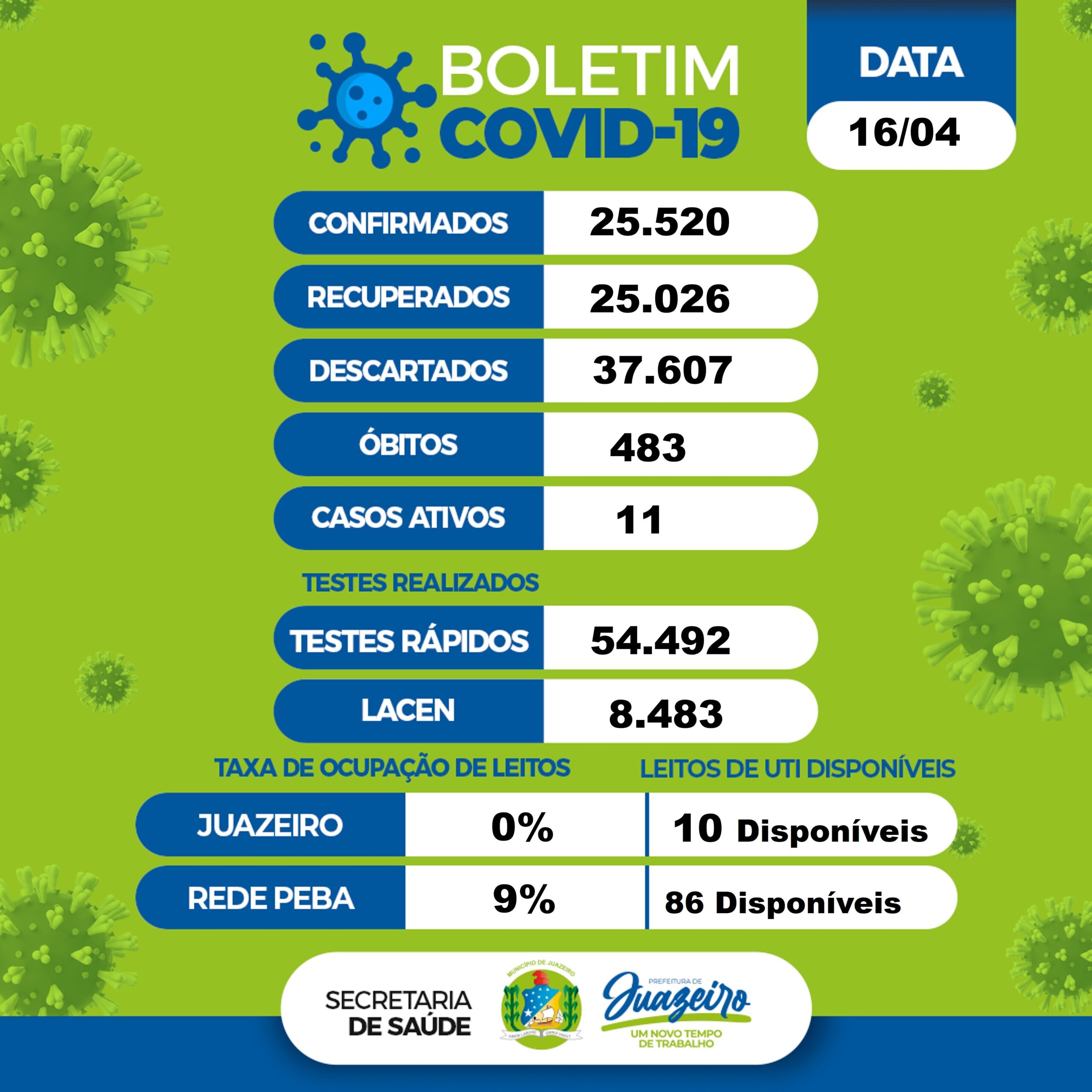 De acordo com o levantamento, 25.520 moradores foram infectados desde o início da pandemia na cidade, dos quais 25.026 já estão recuperados. Os casos descartados somam 37.607. Juazeiro tem 11 casos ativos do novo coronavírus. Não houve registro de óbito. O município contabiliza 483 mortes em decorrência da Covid-19.