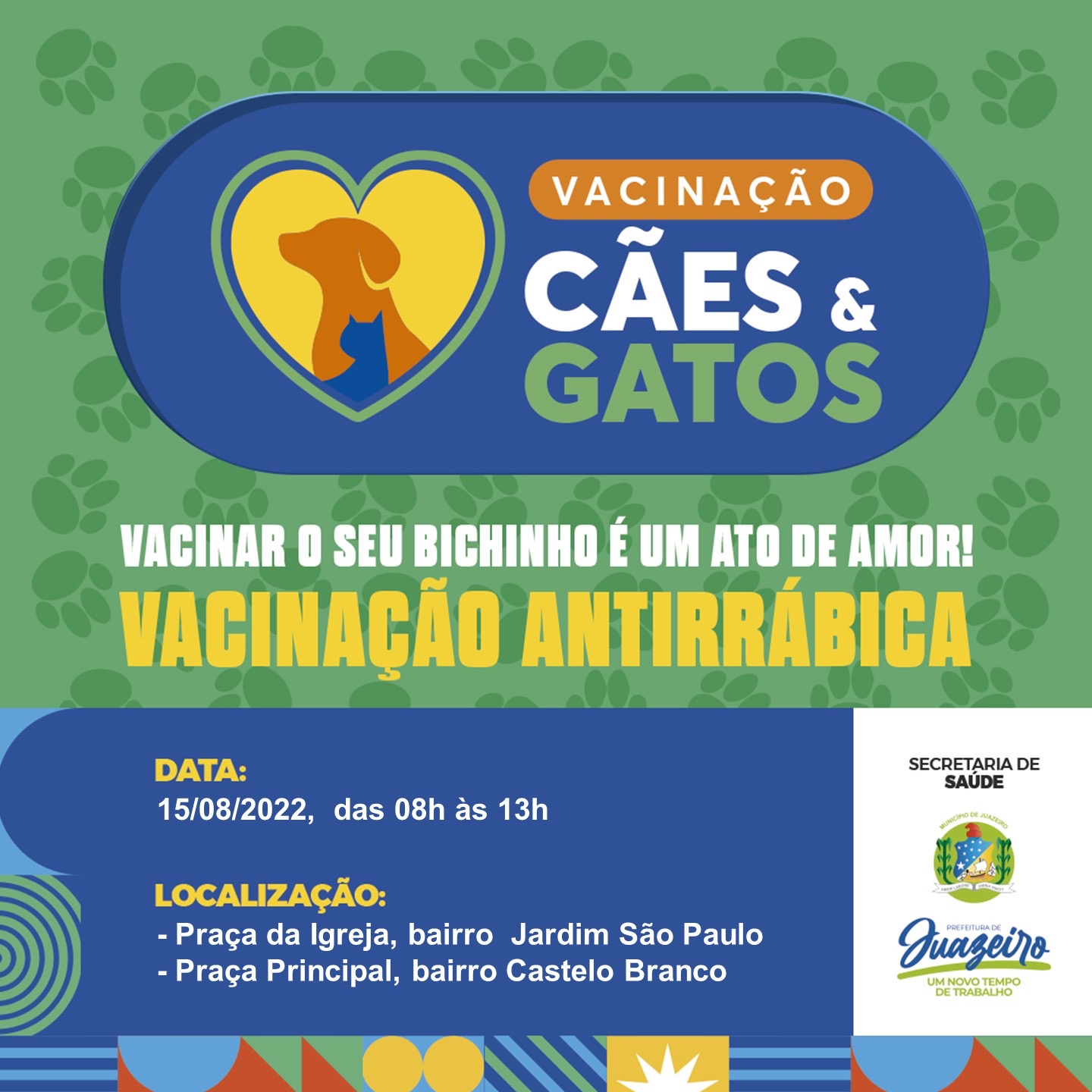 A Prefeitura de Juazeiro, através da Secretaria de Saúde (Sesau) disponibilizou o cronograma da vacinação antirrábica de cães e gatos desta semana. Confira abaixo:
