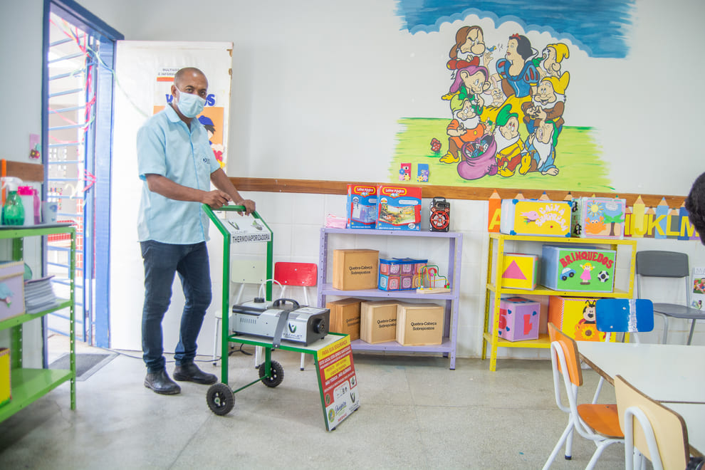 Com o novo material didático para educação infantil, o professor também conta com o auxílio do notebook na condução e registro das aulas, potencializando a qualidade no ensino. As salas estão sendo higienizadas três vezes com as máquinas thermovaporizadoras que foram entregues pela Seduc e auxiliam na sanitização dos ambientes de ensino, a fim de garantir aos alunos a proteção necessária para sua segurança.
