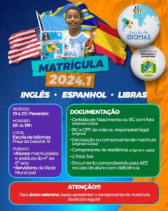 A Prefeitura de Juazeiro vai iniciar na próxima segunda-feira (19) o período de matrículas para o semestre letivo da Escola de Idiomas, ação pioneira da Gestão Suzana Ramos. O espaço oferece cursos gratuitos de Inglês, Espanhol e Língua Brasileira de Sinais (Libras). Os cursos são voltados para alunos da rede municipal, matriculados entre o 4º e o 8º ano do Ensino Fundamental, servidores e professores que atuam na rede municipal.