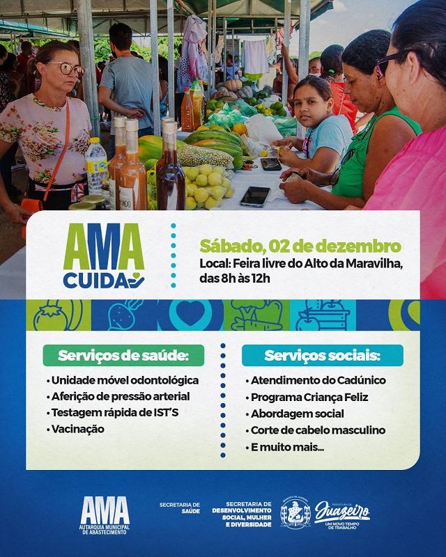 Com o objetivo de valorizar feirantes e permissionários, além de se aproximar da população que circula nas feiras e mercados do município, a Prefeitura de Juazeiro, por meio da Autarquia Municipal de Abastecimento (AMA), irá lançar no próximo sábado (2) o Programa ‘AMA Cuida’. O lançamento será na Feira Livre do Alto da Maravilha, a partir das 8h.