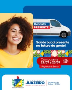 A Prefeitura de Juazeiro, por meio da Secretaria de Saúde/Sesau, segue reforçando o compromisso com o acesso à saúde bucal e a ampliação dos atendimentos em todas as regiões do município. Nesta semana, de 21 a 25 de julho, a Unidade Móvel de Atendimento Odontológico estará presente em cinco localidades diferentes, facilitando o cuidado com a saúde bucal para quem mais precisa.