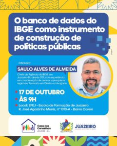 A atividade será conduzida por Saulo Alves de Almeida, chefe da Agência do IBGE em Juazeiro desde 2011, profissional com ampla experiência na coordenação de censos e pesquisas regionais. Formado em Direito e advogado, Saulo vai compartilhar o passo a passo de como acessar, interpretar e aplicar os dados disponíveis pelo órgão em diferentes áreas da gestão pública.