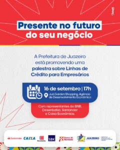 Empresários e microempreendedores de Juazeiro terão a oportunidade de conhecer novas formas de fortalecer seus negócios. A Prefeitura, por meio da Agência de Desenvolvimento Econômico, Emprego e Renda/ADEER, realiza na próxima terça-feira (16), às 17h, no Juá Garden Shopping, uma palestra sobre linhas de crédito e oportunidades de financiamento reunindo instituições financeiras e oferecendo informações práticas para quem deseja investir e expandir sua atividade.