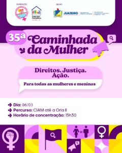 A Prefeitura de Juazeiro, por meio da Secretaria da Mulher e Juventude (SMJ) e do Conselho Municipal de Defesa dos Direitos da Mulher (CMDDM), realiza nesta sexta-feira (6), a partir das 15h30, a 35ª Caminhada da Mulher. A concentração será no Centro Integrado de Atendimento à Mulher (CIAM), no bairro Novo Encontro, com percurso até a Orla II da cidade.