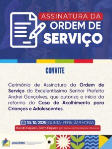A Prefeitura de Juazeiro, por meio da Secretaria de Desenvolvimento Social, Diversidade, Igualdade Racial e Combate à Fome/Sedes, realiza nesta quinta-feira (30), às 9h, a cerimônia de assinatura da Ordem de Serviço que autoriza o início das obras de reforma da Casa de Acolhimento para Crianças e Adolescentes.
