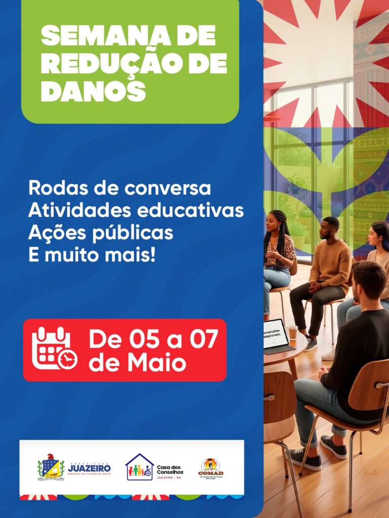 A Prefeitura de Juazeiro realiza, de 5 a 7 de maio, a Semana de Redução de Danos, com serviços gratuitos, ações educativas e formação para profissionais da rede. A iniciativa é organizada pela Secretaria de Articulação Social e Assuntos Religiosos (SAS), Casa dos Conselhos (CDC) e Conselho Municipal sobre Drogas (COMAD).