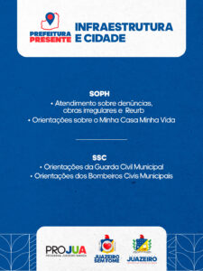 O Distrito de Pinhões será o palco da segunda edição do programa Prefeitura Presente, uma iniciativa da Prefeitura de Juazeiro, por meio da Secretaria de Governo, Gestão e Inovação, que disponibiliza diversos serviços públicos à população. A Secretaria de Segurança Cidadã estará presente nessa grande ação marcada para o próximo sábado (28), das 8h às 13h.