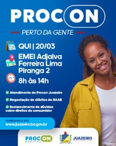 Dando sequência à programação especial do Mês do Consumidor, o Procon Juazeiro levará o programa Procon Perto da Gente ao bairro Piranga II. A ação acontece nesta quinta-feira (20), na EMEI Adjalva Ferreira Lima, das 8h às 14h, oferecendo orientações, registro de reclamações e esclarecimento de dúvidas para os consumidores.