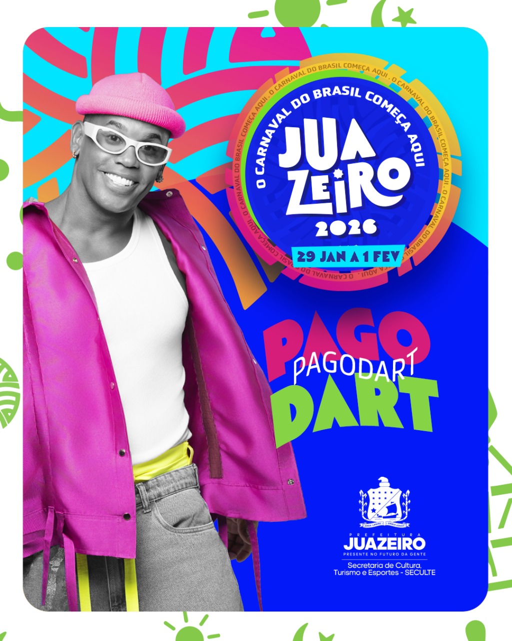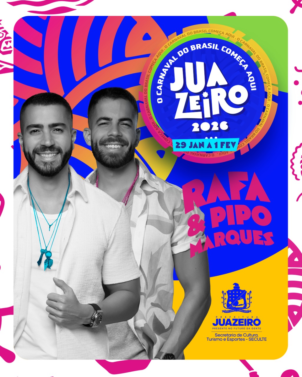 Prefeitura de Juazeiro divulga novas atrações que vão compor a grade oficial do Carnaval de Juazeiro e a cidade já começa a entrar no ritmo da folia. Animando ainda mais a expectativa para 2026, foram confirmados Rafa e Pipo Marques e a banda Pagodart, que chegam para reforçar o clima de alegria com hits que atravessam gerações. A dupla baiana, conhecida pela energia contagiante herdada da tradição de Bell Marques, promete levantar os foliões, enquanto o Pagodart traz toda irreverência e sucesso absoluto do pagode baiano.As novidades se somam às grandes atrações já anunciadas pela Prefeitura, como Ivete Sangalo, Psirico, Bell Marques, Luiz Caldas e Parangolé. Com esse conjunto de estrelas, Juazeiro retoma seu papel como porta de entrada da temporada carnavalesca do Brasil, reunindo referências do axé, do pagodão e de toda a musicalidade que marca a identidade cultural da cidade.