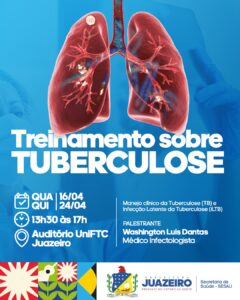 A Secretaria de Saúde de Juazeiro (Sesau), por meio da Gerência de Vigilância Epidemiológica, realizará, nos dias 16 e 24 de abril, um treinamento sobre o manejo clínico da tuberculose (TB) e da infecção latente da tuberculose (ILTB) com profissionais da rede de Atenção Primária à Saúde do município. O evento acontecerá no auditório da UniFTC Juazeiro, das 13h30 às 17h.