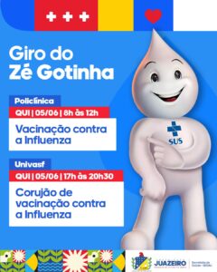 A Secretaria de Saúde de Juazeiro/Sesau informa à população que nesta quinta-feira (5), realizará uma ação especial de vacinação contra a Influenza em dois horários e locais estratégicos, com o objetivo de ampliar a cobertura vacinal e facilitar o acesso à imunização.