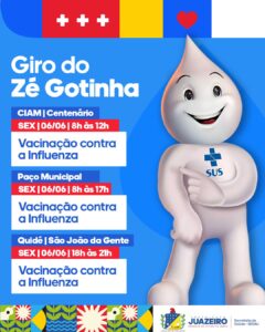A Secretaria de Saúde de Juazeiro/Sesau informa que, nesta sexta-feira (6) de junho, dará continuidade às ações de vacinação contra a Influenza em pontos estratégicos da cidade. As iniciativas visam ampliar a cobertura vacinal e facilitar o acesso da população à imunização.