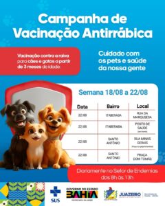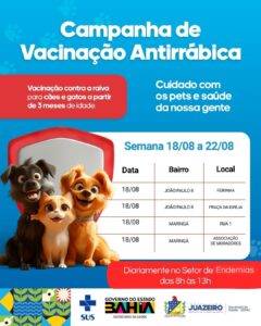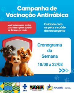 A Secretaria de Saúde de Juazeiro (Sesau), informa sobre o início da Campanha de Vacinação Antirrábica 2025, que acontecerá de 18 de agosto a 15 de setembro, contemplando bairros da sede e localidades do interior do município.