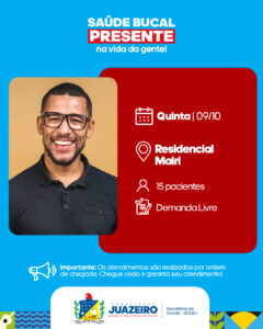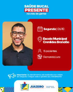 A Unidade de Atendimento Odontológico Móvel/UOM segue levando serviços para a população. A iniciativa realizada pela Prefeitura de Juazeiro, por meio da Secretaria Municipal de Saúde /Sesau está oferecendo, entre os dias 06 e 10 de outubro, 15 atendimentos diários a partir das 8h. É necessário que os pacientes apresentem RG, CPF e Cartão SUS.
